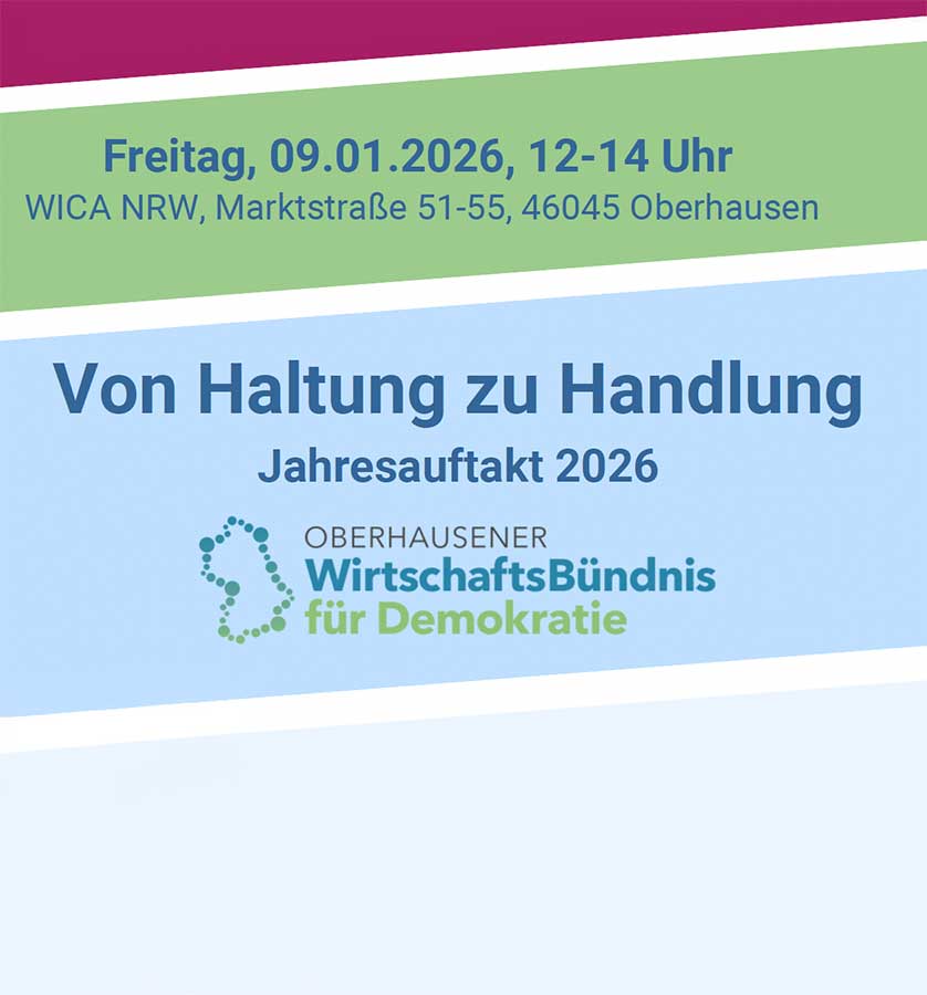 In einer Zeit des demokratischen Vertrauensverlusts setzt das Oberhausener WirtschaftsBündnis für Demokratie, ein Zusammenschluss von engagierten Unternehmerinnen und Unternehmern, Führungskräften und Beschäftigten in Oberhausen, ein starkes Zeichen: Die Mitglieder des Bündnisses bekennen sich klar zu den Werten unseres Grundgesetzes und den Institutionen der parlamentarischen Demokratie. Gleichzeitig ist der Zusammenschluss ein Aufruf der Oberhausener Wirtschaft zu aktivem bürgerschaftlichen Engagement.